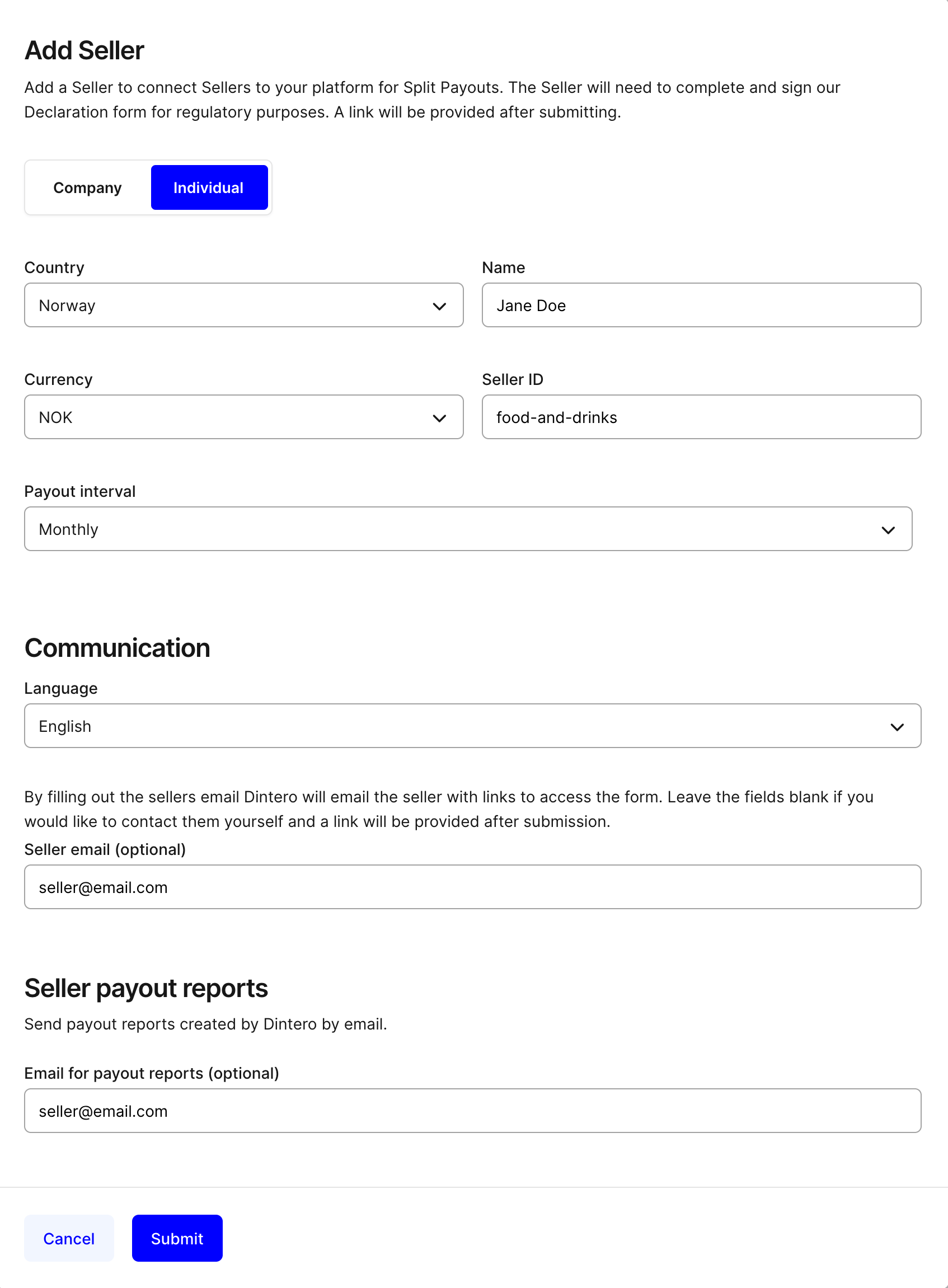 Once your company is approved for Dintero Payout, you can start the process adding your merchants as sellers. You can choose to do this part from Backoffice, or through the API.